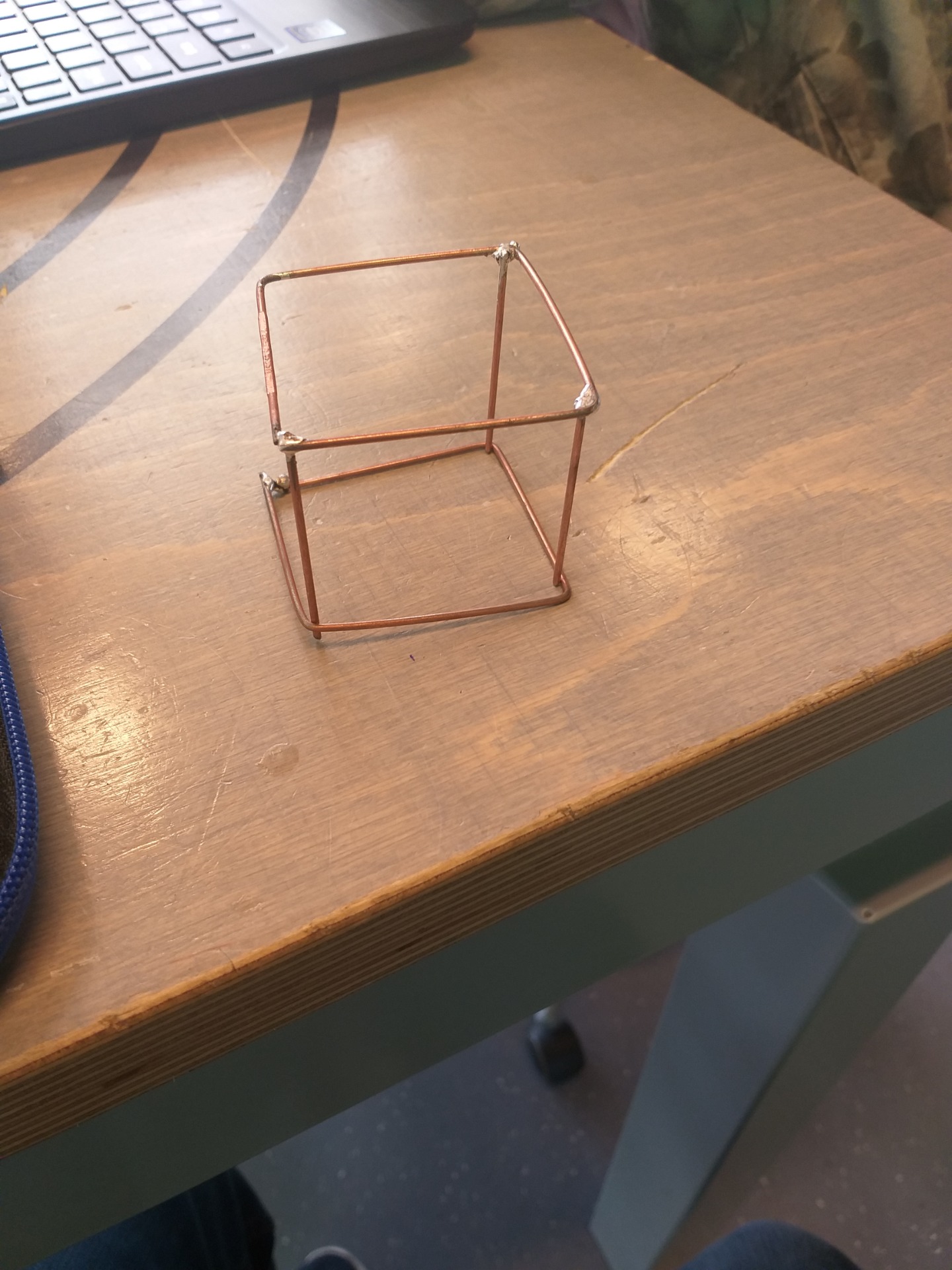 Bij solderen moesten we van een lange, dunne, koperen staaf een kubus maken. Eerst moesten we twee vierkanten maken en daarna moesten we vier staafjes maken van 5 centimeter. Dan moest je alle hoeken schuren totdat de hoeken wit waren. Als alle hoeken en uiteinden wit waren, moest je een soort van dik water over een van de uiteinden/hoeken doen en dan moest je het soldeerapparaat pakken en een ijzerdraadje. Dan hield je het ijzerdraadje teken het koper en dan hou je tegelijk het soldeerapparaat ertegenaan. Dan kun je er iets anders op zetten en dan was het de bedoeling dat je een kubus zou maken.